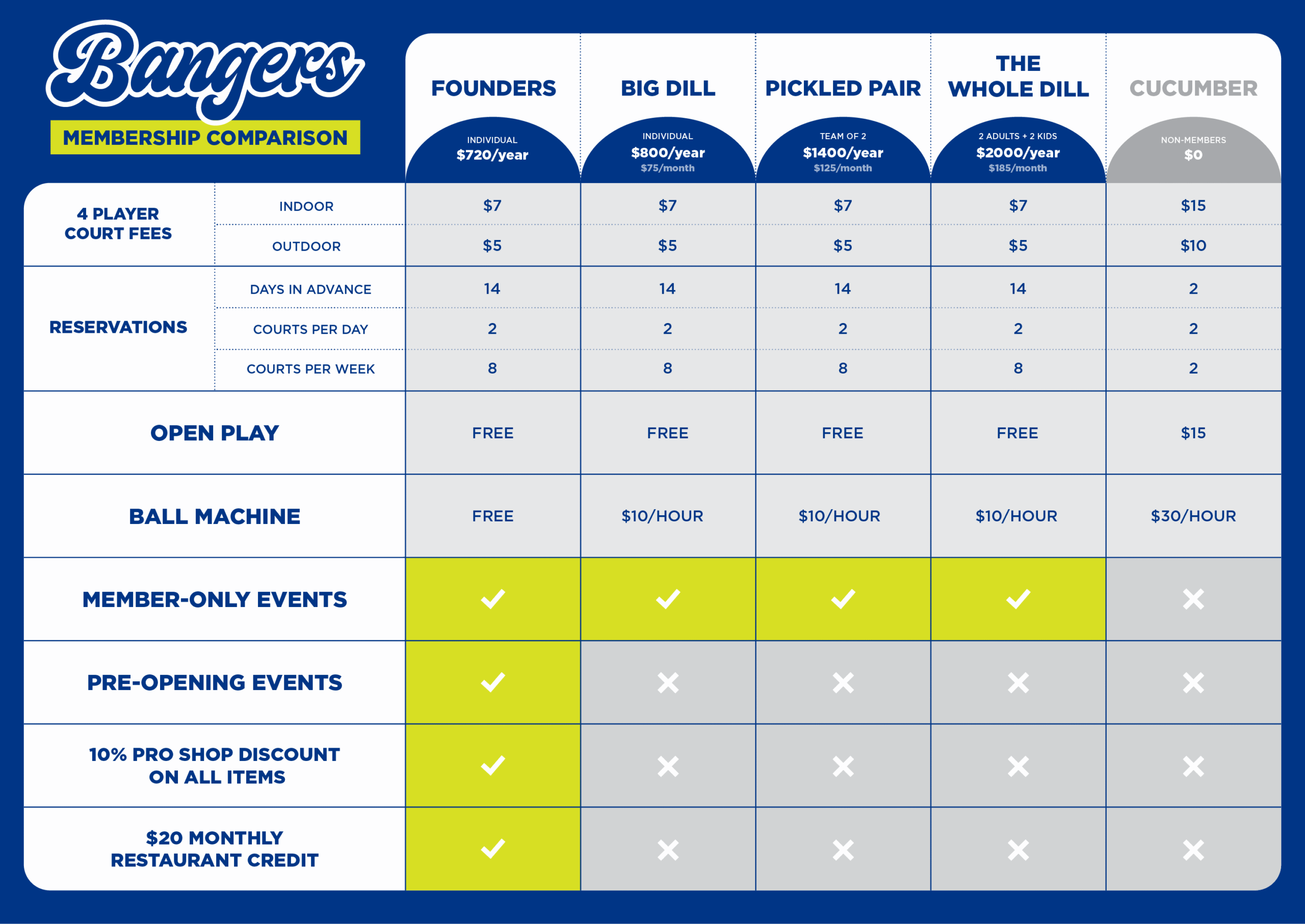 Packages Term: Bangers Pickleball packages are valid for one year from the package’s start date. Members who choose a monthly payment plan may incur a penalty if they cancel before completing the one-year term.